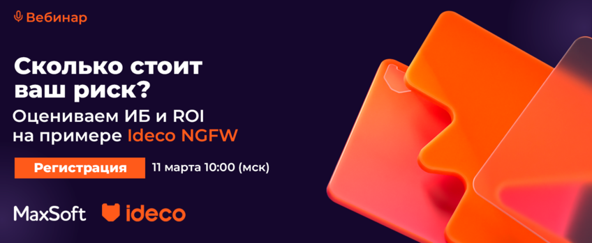 Вебинар "Сколько стоит ваш риск? Оцениваем ИБ и ROI на примере Ideco NGFW Novum"12 марта 2026 | 10:00 (мск)